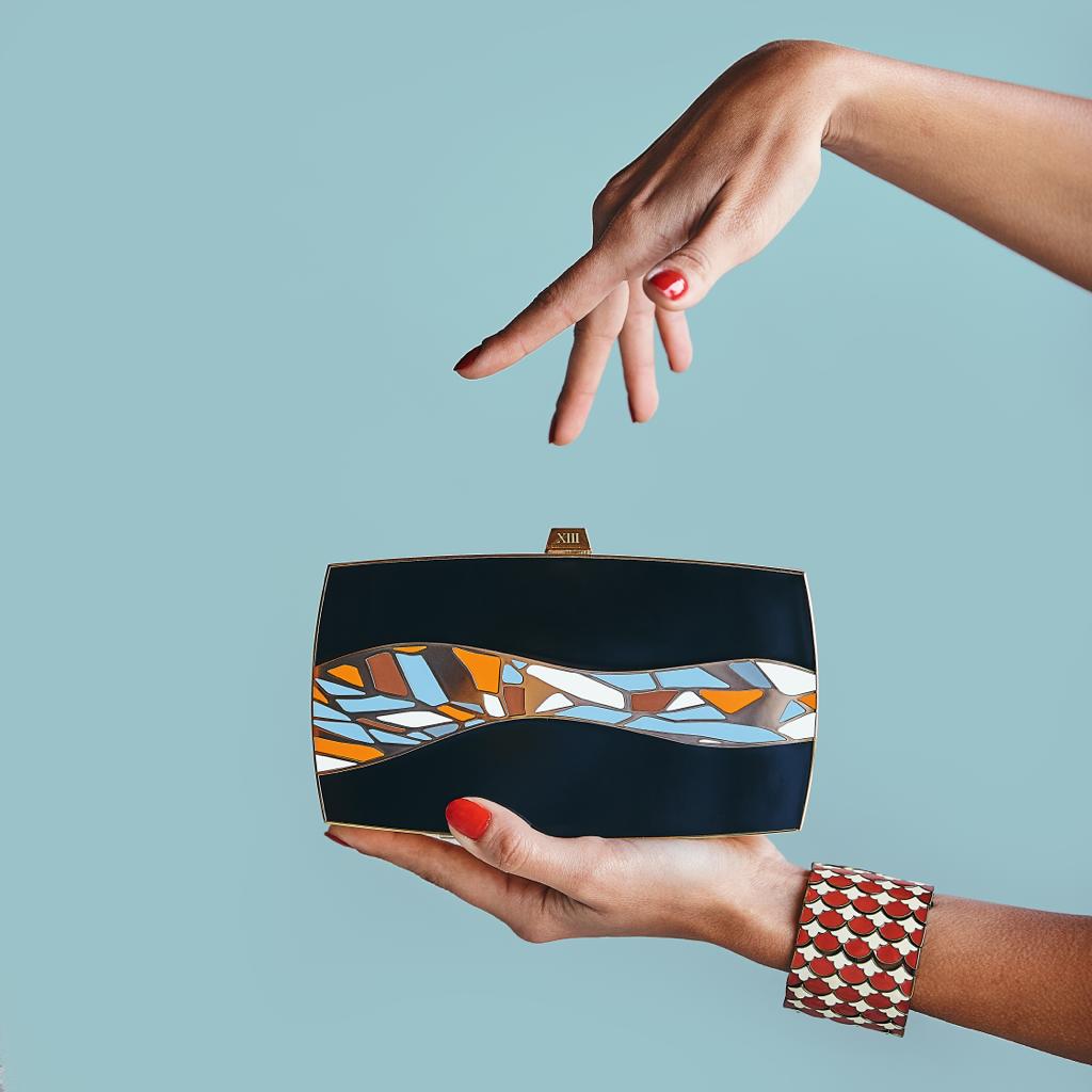 Bag #5 is called “The First Wave”. It is both a visual interpretation of that first time she sets her eyes on the crystal-clear ocean, but also an expression of that first wave of freedom that runs through her body, and that fills her with hope & relief.