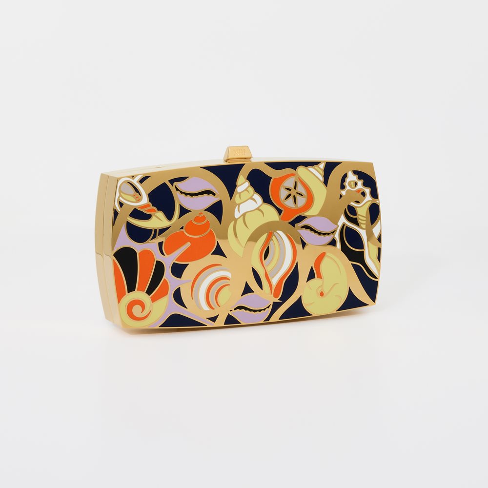 Inspired by the sea and all its wonders washing up on the shore, the Shell clutch features charming enameled illustrations in vibrant shades, set within a gold-plated case.